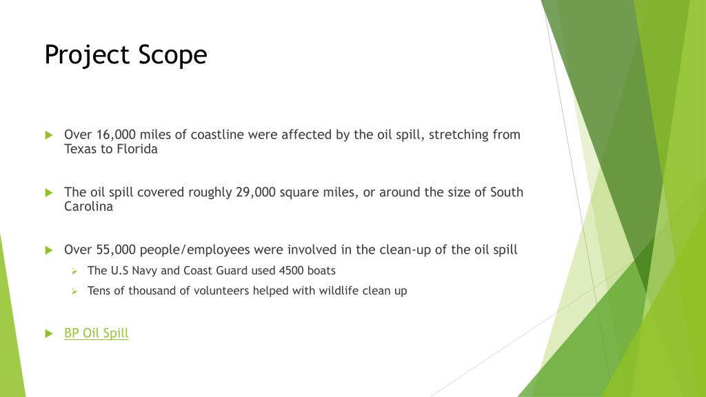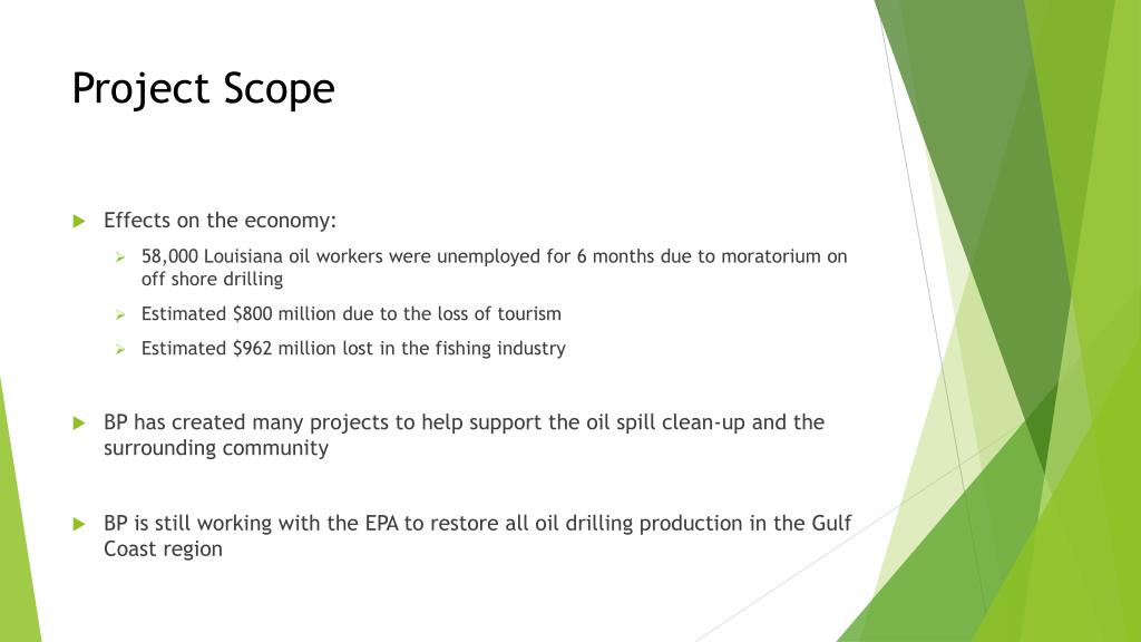 Project Scope • Effects on the economy: • 58,000 Louisiana oil workers were unemployed for 6 months due to moratorium on off shore drilling • Estimated $800 million due to the loss of tourism • Estimated $962 million lost in the fishing industry • BP has created many projects to help support the oil spill clean-up and the surrounding community • BP is still working with the EPA to restore all oil drilling production in the Gulf Coast region