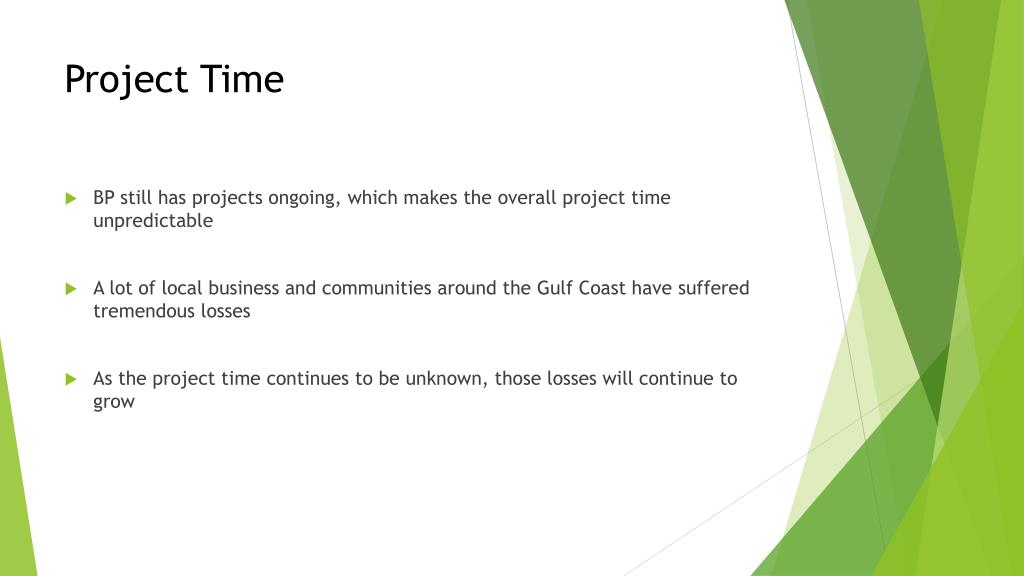 Project Time • BP still has projects ongoing, which makes the overall project time unpredictable • A lot of local business and communities around the Gulf Coast have suffered tremendous losses • As the project time continues to be unknown, those losses will continue to grow