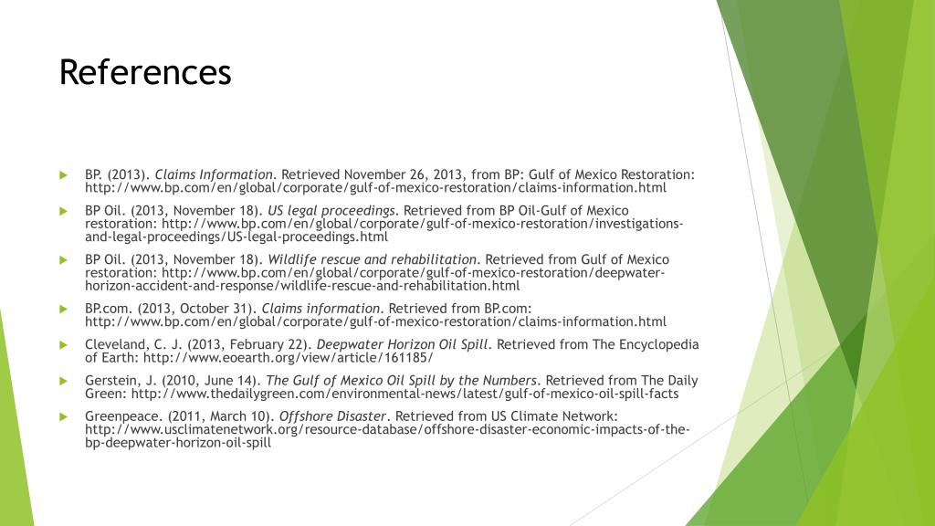 References • BP. (2013). Claims Information. Retrieved November 26, 2013, from BP: Gulf of Mexico Restoration: http://www.bp.com/en/global/corporate/gulf-of-mexico-restoration/claims-information.html • BP Oil. (2013, November 18). US legal proceedings. Retrieved from BP Oil-Gulf of Mexico restoration: http://www.bp.com/en/global/corporate/gulf-of-mexico-restoration/investigations-and-legal-proceedings/US-legal-proceedings.html • BP Oil. (2013, November 18). Wildlife rescue and rehabilitation. Retrieved from Gulf of Mexico restoration: http://www.bp.com/en/global/corporate/gulf-of-mexico-restoration/deepwater-horizon-accident-and-response/wildlife-rescue-and-rehabilitation.html • BP.com. (2013, October 31). Claims information. Retrieved from BP.com: http://www.bp.com/en/global/corporate/gulf-of-mexico-restoration/claims-information.html • Cleveland, C. J. (2013, February 22). Deepwater Horizon Oil Spill. Retrieved from The Encyclopedia of Earth: http://www.eoearth.org/view/article/161185/ • Gerstein, J. (2010, June 14). The Gulf of Mexico Oil Spill by the Numbers. Retrieved from The Daily Green: http://www.thedailygreen.com/environmental-news/latest/gulf-of-mexico-oil-spill-facts • Greenpeace. (2011, March 10). Offshore Disaster. Retrieved from US Climate Network: http://www.usclimatenetwork.org/resource-database/offshore-disaster-economic-impacts-of-the-bp-deepwater-horizon-oil-spill