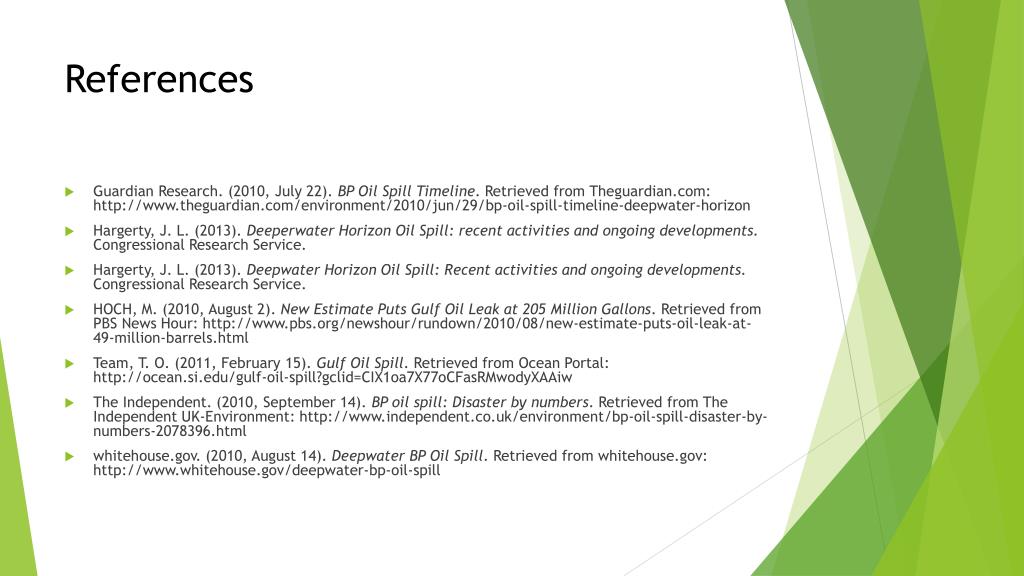 References • Guardian Research. (2010, July 22). BP Oil Spill Timeline. Retrieved from Theguardian.com: http://www.theguardian.com/environment/2010/jun/29/bp-oil-spill-timeline-deepwater-horizon • Hargerty, J. L. (2013). Deeperwater Horizon Oil Spill: recent activities and ongoing developments. Congressional Research Service. • Hargerty, J. L. (2013). Deepwater Horizon Oil Spill: Recent activities and ongoing developments. Congressional Research Service. • HOCH, M. (2010, August 2). New Estimate Puts Gulf Oil Leak at 205 Million Gallons. Retrieved from PBS News Hour: http://www.pbs.org/newshour/rundown/2010/08/new-estimate-puts-oil-leak-at-49-million-barrels.html • Team, T. O. (2011, February 15). Gulf Oil Spill. Retrieved from Ocean Portal: http://ocean.si.edu/gulf-oil-spill?gclid=CIX1oa7X77oCFasRMwodyXAAiw • The Independent. (2010, September 14). BP oil spill: Disaster by numbers. Retrieved from The Independent UK-Environment: http://www.independent.co.uk/environment/bp-oil-spill-disaster-by-numbers-2078396.html • whitehouse.gov. (2010, August 14). Deepwater BP Oil Spill. Retrieved from whitehouse.gov: http://www.whitehouse.gov/deepwater-bp-oil-spill