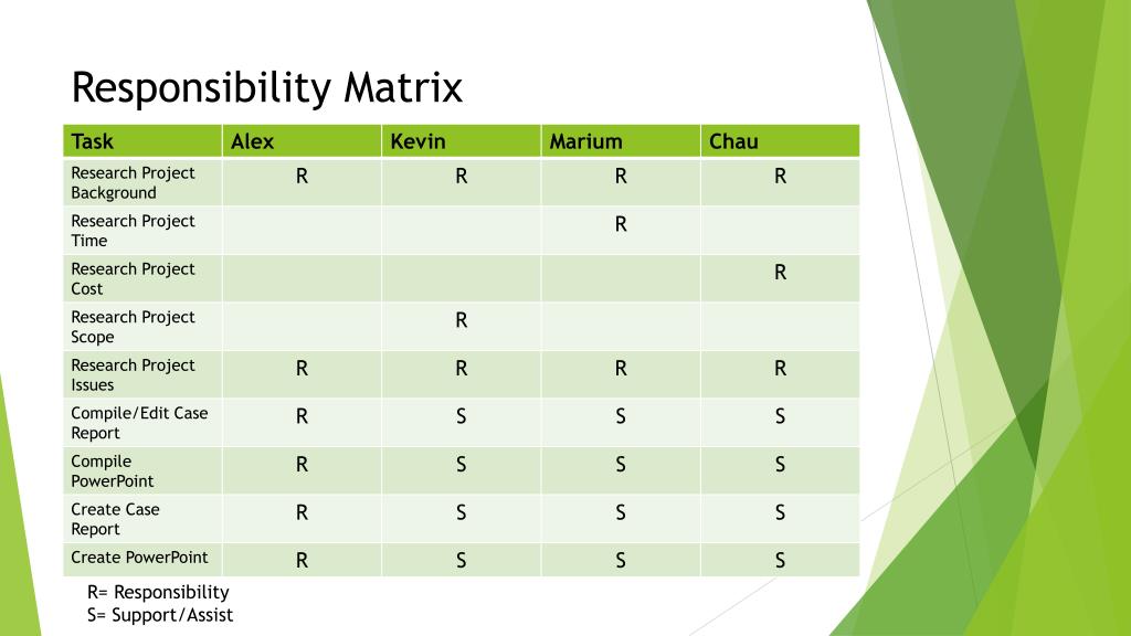 Responsibility Matrix R= Responsibility S= Support/Assist