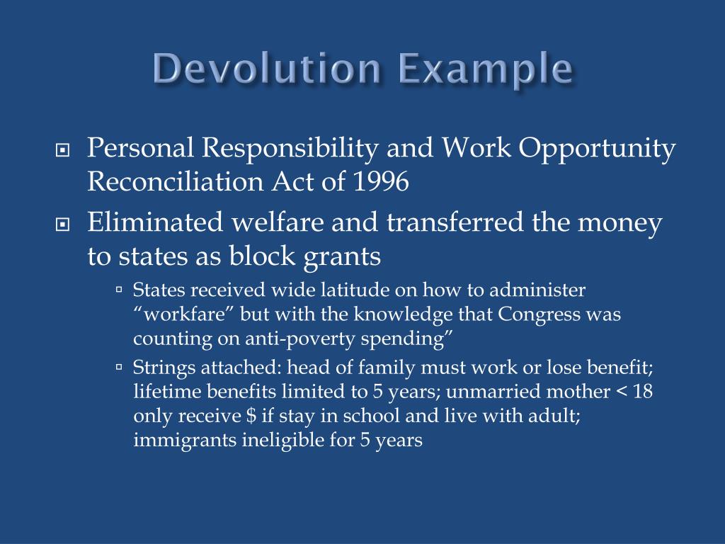 Devolution Example • Personal Responsibility and Work Opportunity Reconciliation Act of 1996 • Eliminated welfare and transferred the money to states as block grants • States received wide latitude on how to administer “workfare” but with the knowledge that Congress was counting on anti-poverty spending” • Strings attached: head of family must work or lose benefit; lifetime benefits limited to 5 years; unmarried mother < 18 only receive $ if stay in school and live with adult; immigrants ineligible for 5 years