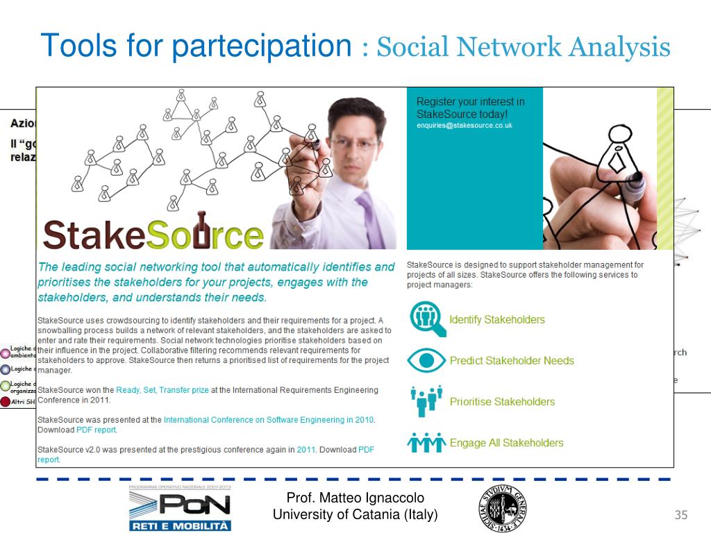 Tools for participation: Social Network Analysis • Social Network Analysisis the methodical analysis of social networks • SNA views social relationships in terms of network theory, consisting of nodes (representing individual actors within the network) and ties (which represent relationships between the individuals, such as friendship, kinship, organizational position, sexual relationships, etc.) • These networks are often depicted in a social network diagram, where nodes are represented as points and ties are represented as lines. A social network diagram displaying friendship ties among a set of Facebook users. (Source: Wikipedia) Prof. Matteo Ignaccolo University of Catania (Italy) 31