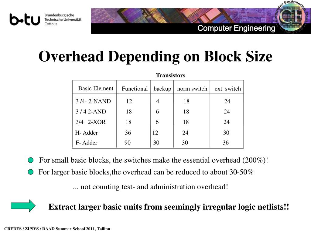 Overhead Depending on Block Size Transistors Basic Element Functional backup norm switch ext. switch 3 /4- 2-NAND 12 4 18 24 3 / 4 2-AND 18 6 18 24 3/4 2-XOR 18 6 18 24 H- Adder 36 12 24 30 F- Adder 90 30 30 36 For small basic blocks, the switches make the essential overhead (200%)! For larger basic blocks,the overhead can be reduced to about 30-50% ... not counting test- and administration overhead! Extract larger basic units from seemingly irregular logic netlists!!