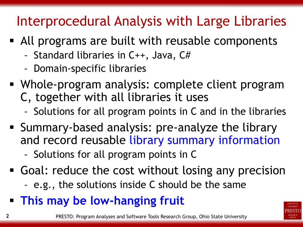 Interprocedural Analysis with Large Libraries • All programs are built with reusable components • Standard libraries in C++, Java, C# • Domain-specific libraries • Whole-program analysis: complete client program C, together with all libraries it uses • Solutions for all program points in C and in the libraries • Summary-based analysis: pre-analyze the library and record reusable library summary information • Solutions for all program points in C • Goal: reduce the cost without losing any precision • e.g., the solutions inside C should be the same • This may be low-hanging fruit