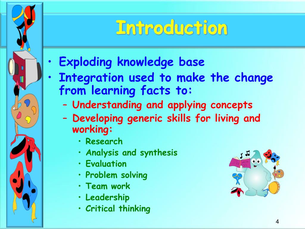 Introduction • Exploding knowledge base • Integration used to make the change from learning facts to: • Understanding and applying concepts • Developing generic skills for living and working: • Research • Analysis and synthesis • Evaluation • Problem solving • Team work • Leadership • Critical thinking