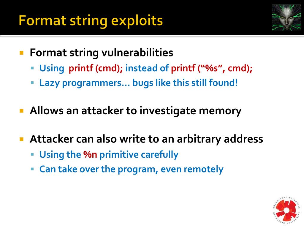 Format string exploits • Format string vulnerabilities • Using printf (cmd); instead of printf (“%s”, cmd); • Lazy programmers… bugs like this still found! • Allows an attacker to investigate memory • Attacker can also write to an arbitrary address • Using the %nprimitive carefully • Can take over the program, even remotely