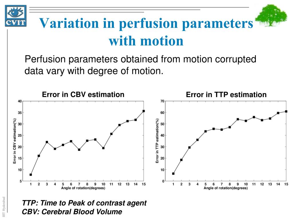 Variation in perfusion parameters with motion Perfusion parameters obtained from motion corrupted data vary with degree of motion. Error in CBV estimation Error in TTP estimation TTP: Time to Peak of contrast agent CBV: Cerebral Blood Volume