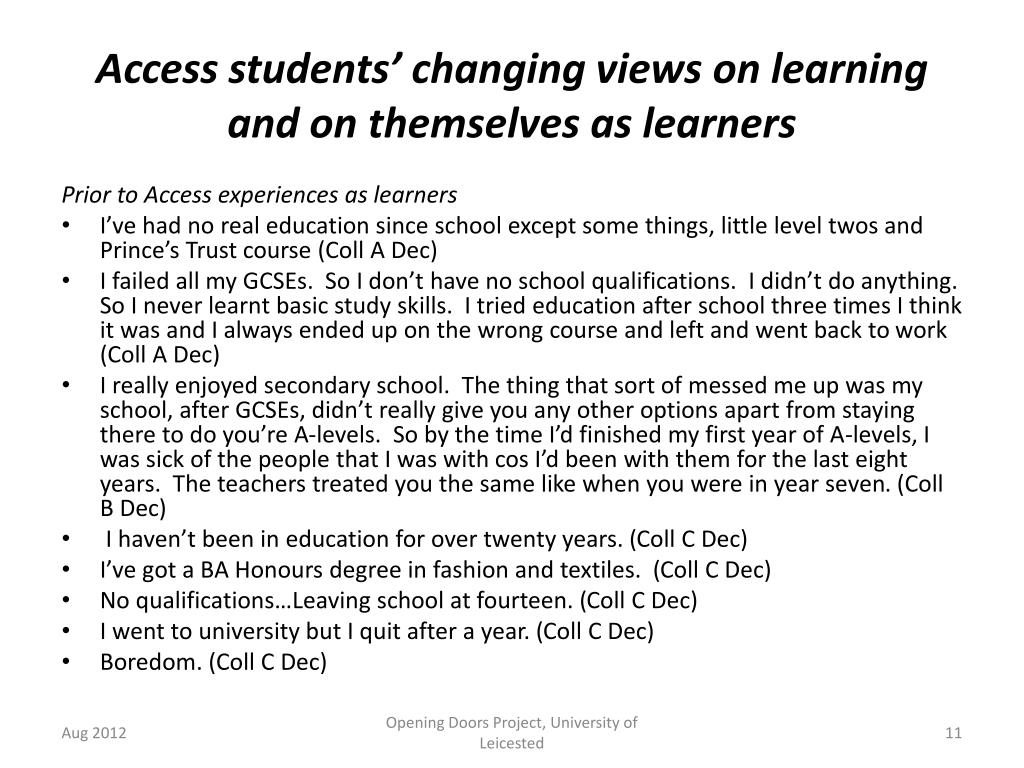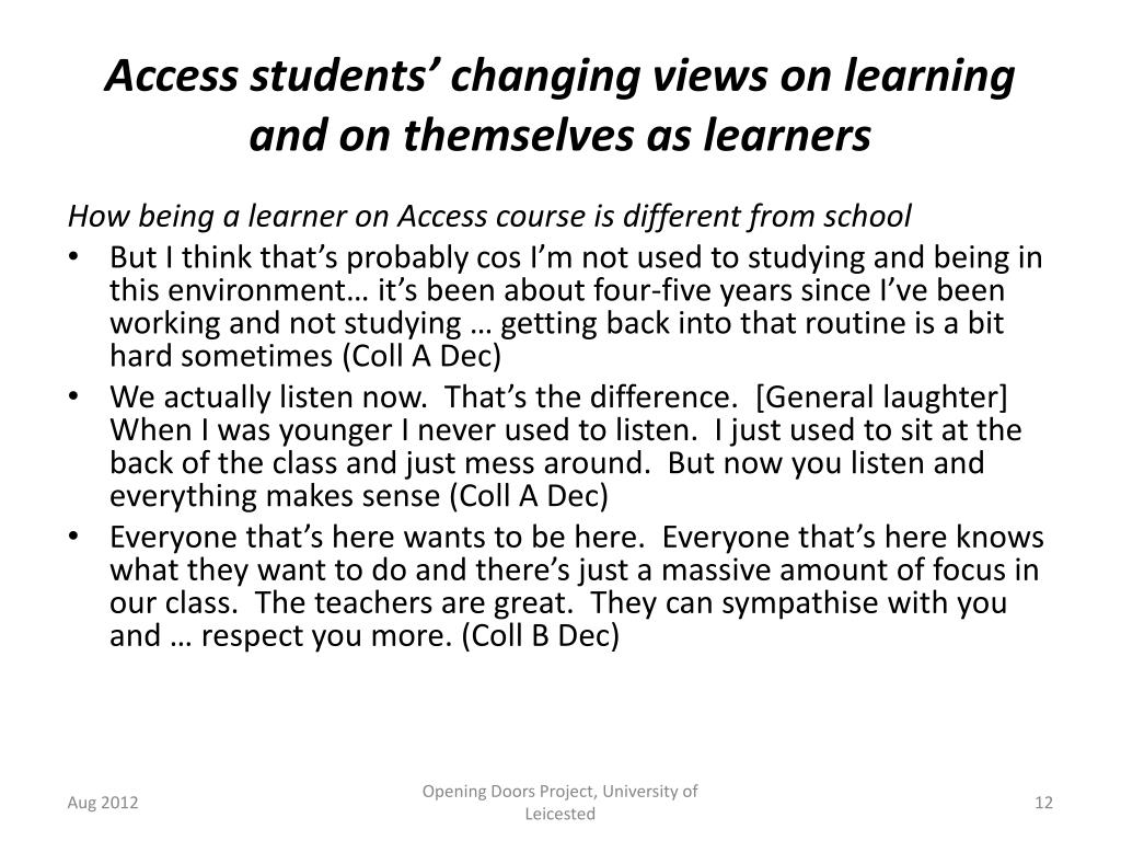 Access students’ changing views on learning and on themselves as learners As a learner at the start of the Access course • I was really rubbish. All my assignments were like really rubbish. I was getting passes all the time. Now I can expect to get like merit or distinction (Coll A March) • Not a very good one … , I hated school anyway. I wasn’t particularly enjoying it the first couple of months we were doing it either just because it was getting trying to (Coll B March) • I was really enthusiastic because being a mature student I was sort of determined to do well in this course (Coll B March) As a learner after 3 months on the Access course • The course is going okay so far. I’m finding it a bit difficult in places but obviously there’s help out there for me. (Coll A Dec) • I really enjoy coming to college and I love learning. But the problem with access course is it’s aimed for mature students, but there’s no financial help. (Coll B Dec) As a learner after 6 months on Access course • I feel like I’ve just got better and more intelligent actually. (Coll A March) • So now it’s like we understand a bit more, you know, the new ways, the way everything works and stuff now. I was a bit rusty before. (Coll A March) • now we’re this side of the Christmas holiday, I’ve felt much better about it and I enjoy it now. (Coll B March) Opening Doors Project, University of Leicested
