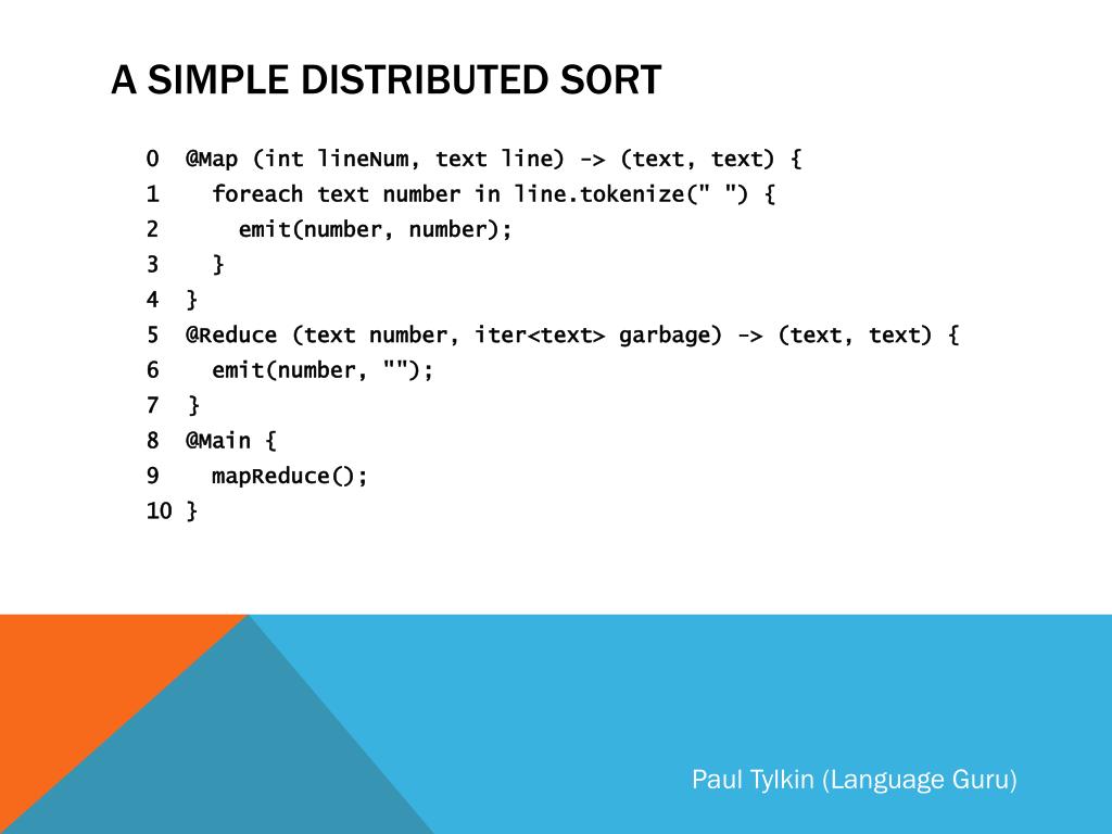 A simple distributed sort 0 @Map (intlineNum, text line) -> (text, text) { 1 foreachtext number in line.tokenize(" ") { 2 emit(number, number); 3 } 4 } 5 @Reduce (text number, iter<text> garbage) -> (text, text) { 6 emit(number, ""); • } 8 @Main { 9 mapReduce(); 10 } Paul Tylkin (Language Guru)