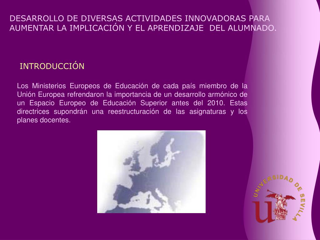 DESARROLLO DE DIVERSAS ACTIVIDADES INNOVADORAS PARA AUMENTAR LA IMPLICACIÓN Y EL APRENDIZAJE DEL ALUMNADO. INTRODUCCIÓN Los Ministerios Europeos de Educación de cada país miembro de la Unión Europea refrendaron la importancia de un desarrollo armónico de un Espacio Europeo de Educación Superior antes del 2010. Estas directrices supondrán una reestructuración de las asignaturas y los planes docentes.