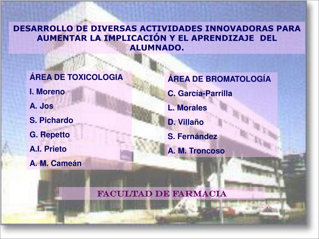 DESARROLLO DE DIVERSAS ACTIVIDADES INNOVADORAS PARA AUMENTAR LA IMPLICACIÓN Y EL APRENDIZAJE DEL ALUMNADO. ÁREA DE TOXICOLOGIA I. Moreno A. Jos S. Pichardo G. Repetto A.I. Prieto A. M. Cameán ÁREA DE BROMATOLOGÍA C. García-Parrilla L. Morales D. Villaño S. Fernández A. M. Troncoso FACULTAD DE FARMACIA
