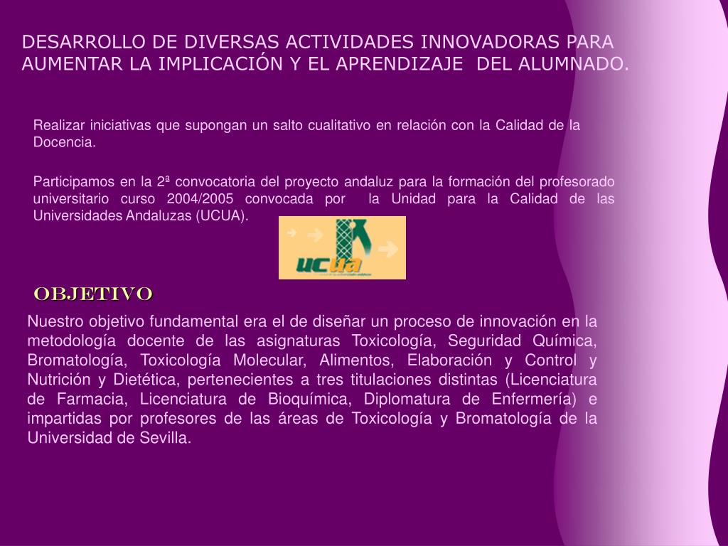 DESARROLLO DE DIVERSAS ACTIVIDADES INNOVADORAS PARA AUMENTAR LA IMPLICACIÓN Y EL APRENDIZAJE DEL ALUMNADO. Realizar iniciativas que supongan un salto cualitativo en relación con la Calidad de la Docencia. Participamos en la 2ª convocatoria del proyecto andaluz para la formación del profesorado universitario curso 2004/2005 convocada por la Unidad para la Calidad de las Universidades Andaluzas (UCUA). OBJETIVO Nuestro objetivo fundamental era el de diseñar un proceso de innovación en la metodología docente de las asignaturas Toxicología, Seguridad Química, Bromatología, Toxicología Molecular, Alimentos, Elaboración y Control y Nutrición y Dietética, pertenecientes a tres titulaciones distintas (Licenciatura de Farmacia, Licenciatura de Bioquímica, Diplomatura de Enfermería) e impartidas por profesores de las áreas de Toxicología y Bromatología de la Universidad de Sevilla.