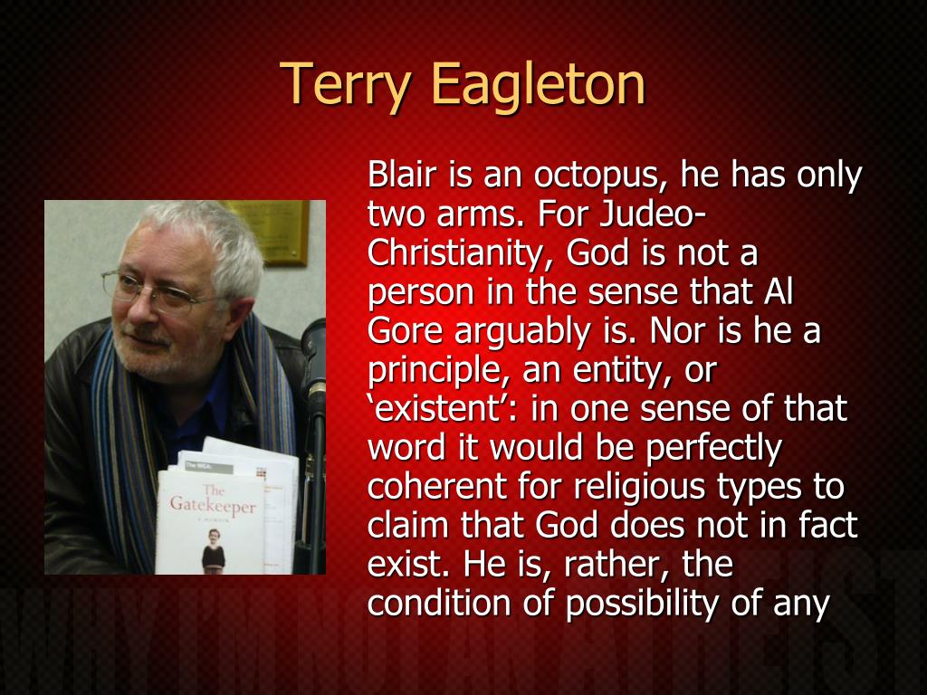 Terry Eagleton Blair is an octopus, he has only two arms. For Judeo-Christianity, God is not a person in the sense that Al Gore arguably is. Nor is he a principle, an entity, or ‘existent’: in one sense of that word it would be perfectly coherent for religious types to claim that God does not in fact exist. He is, rather, the condition of possibility of any