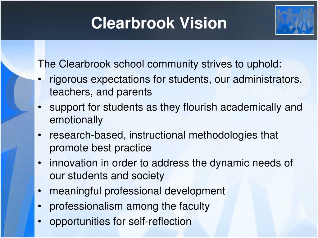 Clearbrook Vision The Clearbrook school community strives to uphold: • rigorous expectations for students, our administrators, teachers, and parents • support for students as they flourish academically and emotionally • research-based, instructional methodologies that promote best practice • innovation in order to address the dynamic needs of our students and society • meaningful professional development • professionalism among the faculty • opportunities for self-reflection