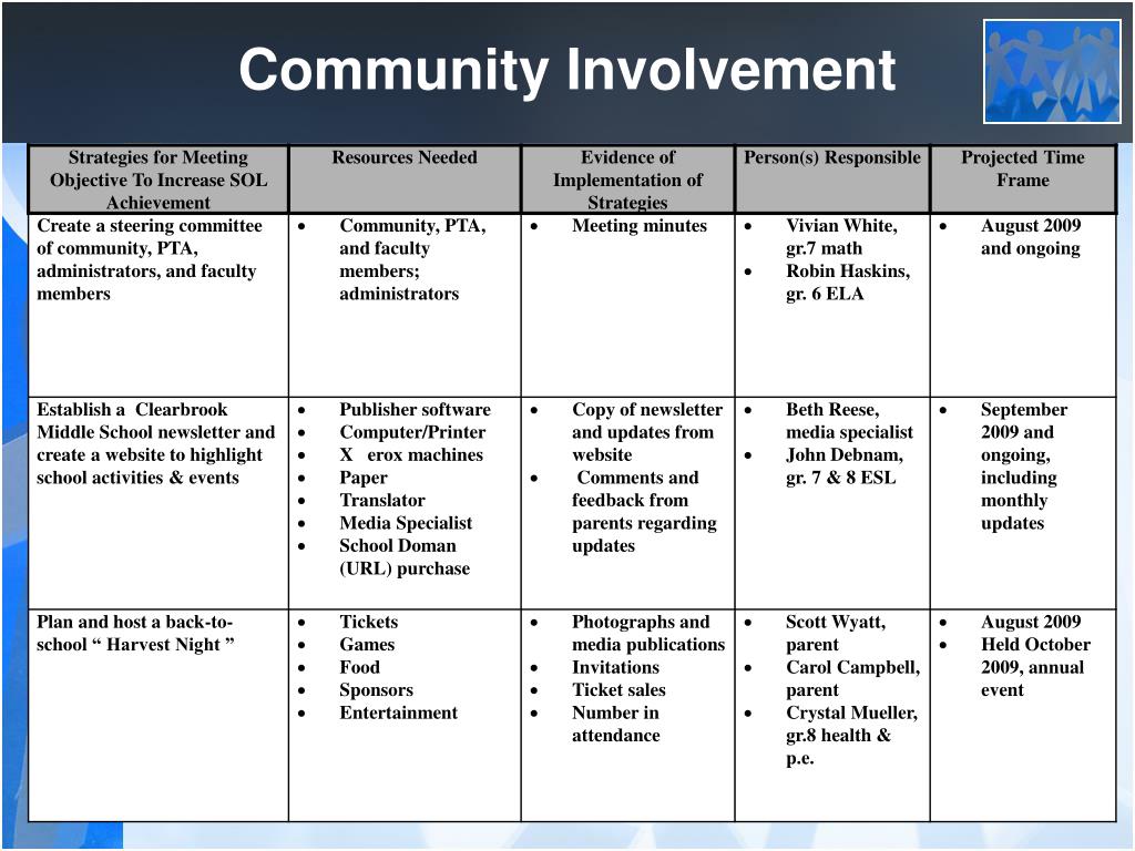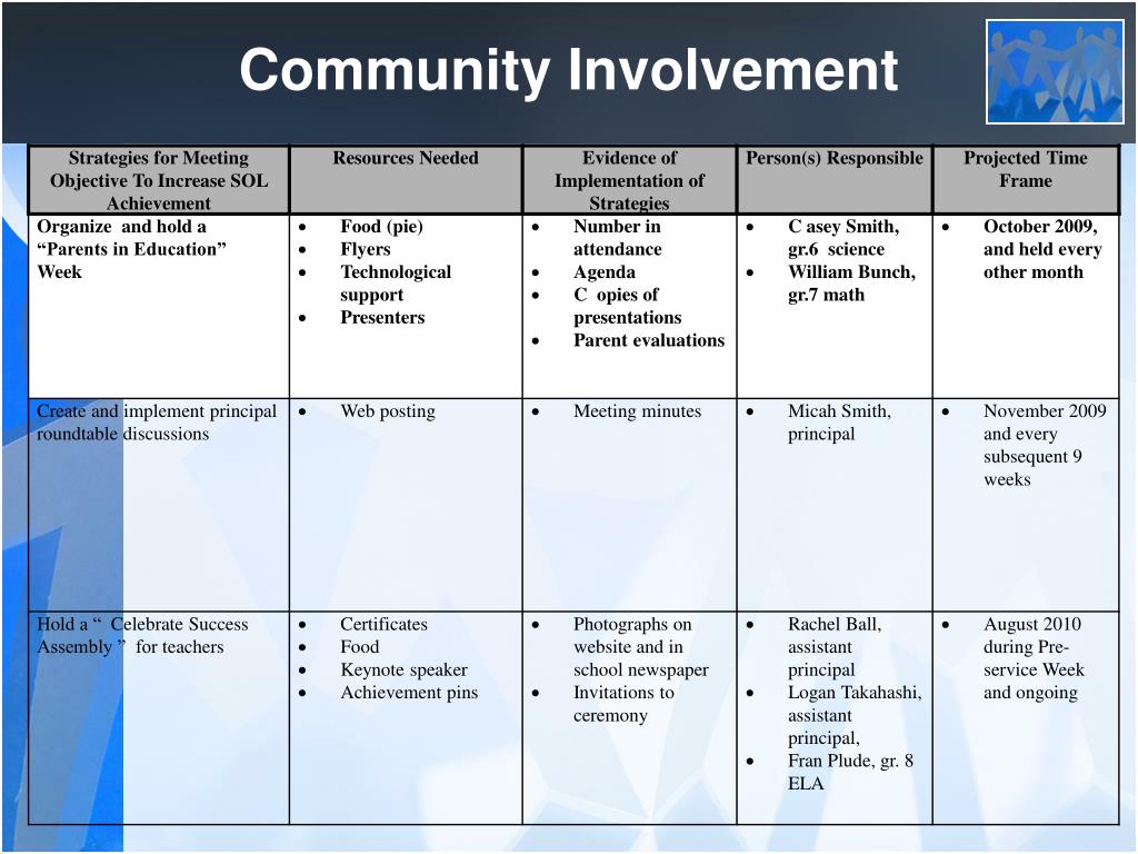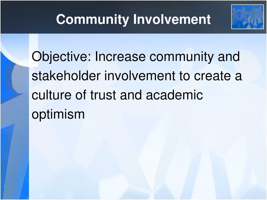 Community Involvement Objective: Increase community and stakeholder involvement to create a culture of trust and academic optimism