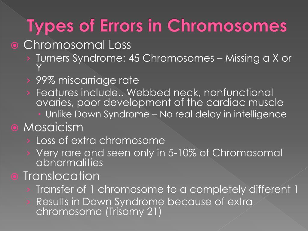 Types of Errors in Chromosomes • Chromosomal Loss • Turners Syndrome: 45 Chromosomes – Missing a X or Y • 99% miscarriage rate • Features include.. Webbed neck, nonfunctional ovaries, poor development of the cardiac muscle • Unlike Down Syndrome – No real delay in intelligence • Mosaicism • Loss of extra chromosome • Very rare and seen only in 5-10% of Chromosomal abnormalities • Translocation • Transfer of 1 chromosome to a completely different 1 • Results in Down Syndrome because of extra chromosome (Trisomy 21)