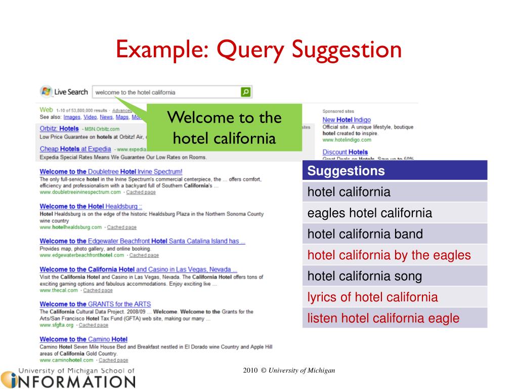 Example: Query Suggestion Welcome to the hotel california