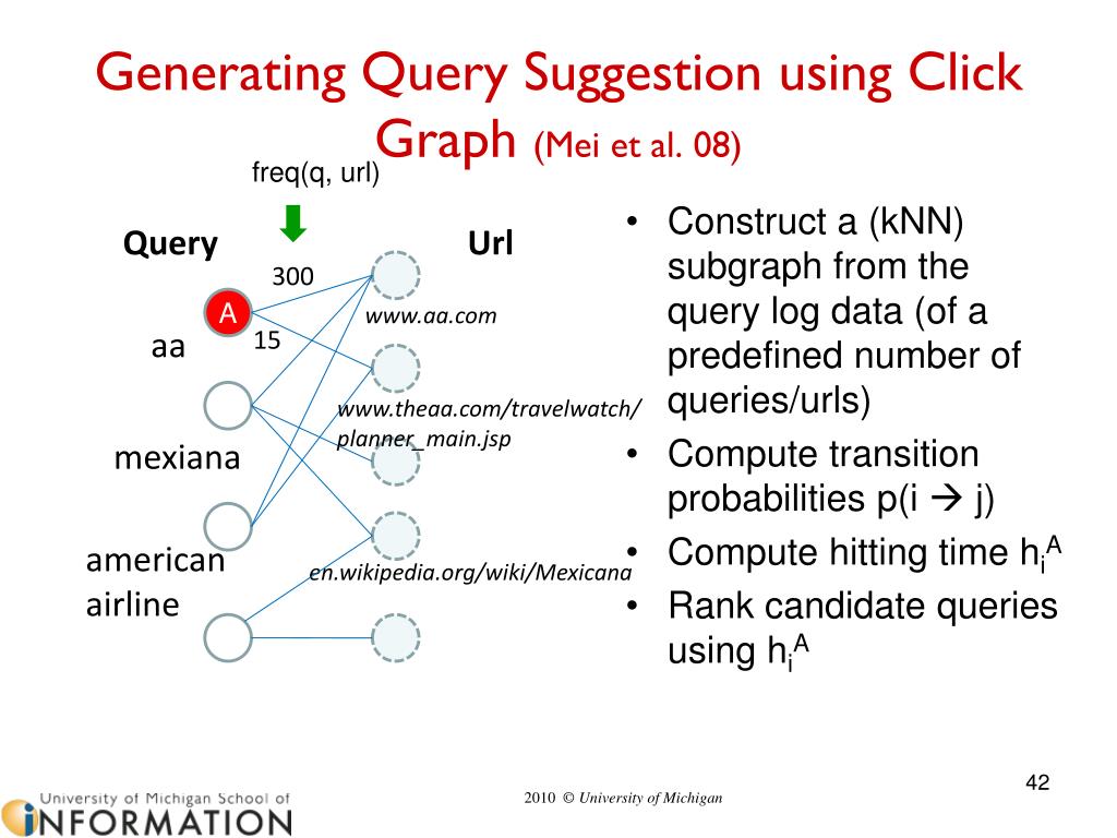 Generating Query Suggestion using Click Graph (Mei et al. 08) freq(q, url) • Construct a (kNN) subgraph from the query log data (of a predefined number of queries/urls) • Compute transition probabilities p(i j) • Compute hitting time hiA • Rank candidate queries using hiA Query Url 300 A www.aa.com aa 15 www.theaa.com/travelwatch/planner_main.jsp mexiana american airline en.wikipedia.org/wiki/Mexicana
