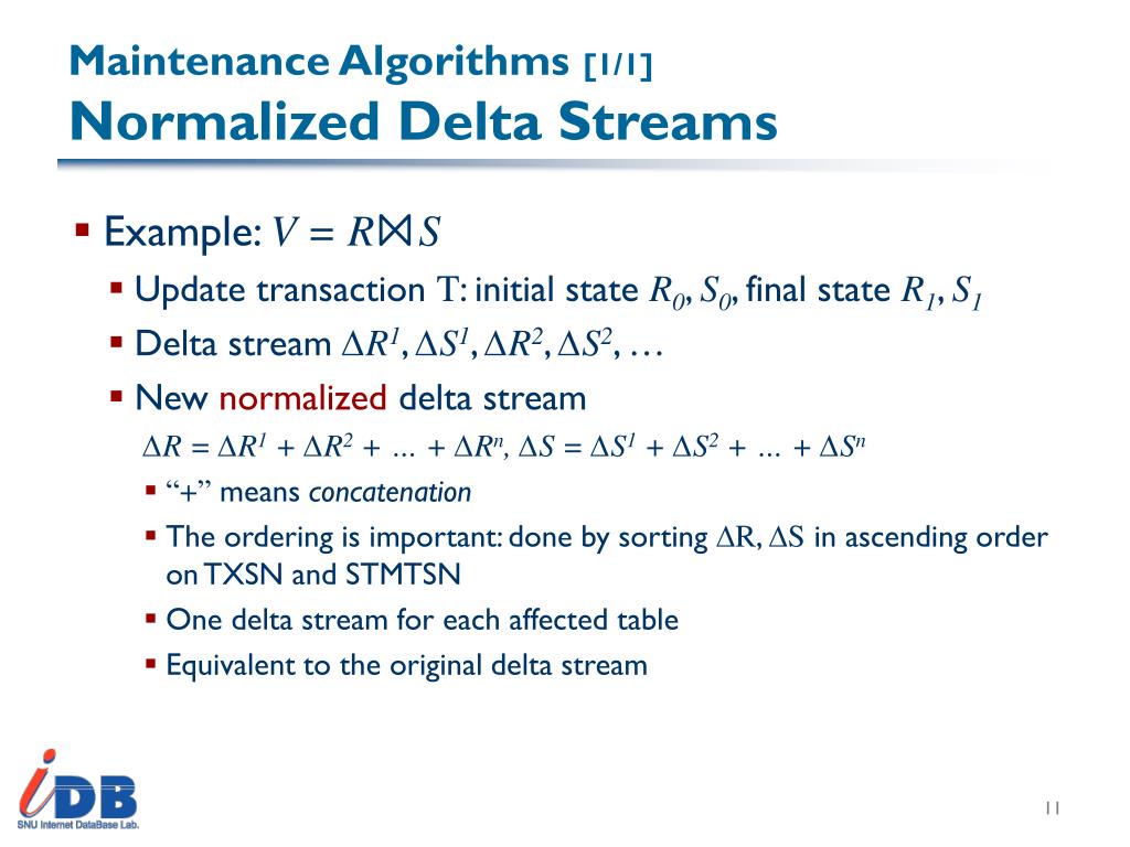 Maintenance Algorithms [1/1]Normalized Delta Streams • Example: V = R S • Update transaction T: initial state R0, S0, final state R1, S1 • Delta stream ∆R1, ∆S1, ∆R2, ∆S2, … • New normalized delta stream ∆R = ∆R1+ ∆R2 + … + ∆Rn, ∆S = ∆S1 + ∆S2+ … + ∆Sn • “+” means concatenation • The ordering is important: done by sorting ∆R, ∆S in ascending order on TXSN and STMTSN • One delta stream for each affected table • Equivalent to the original delta stream