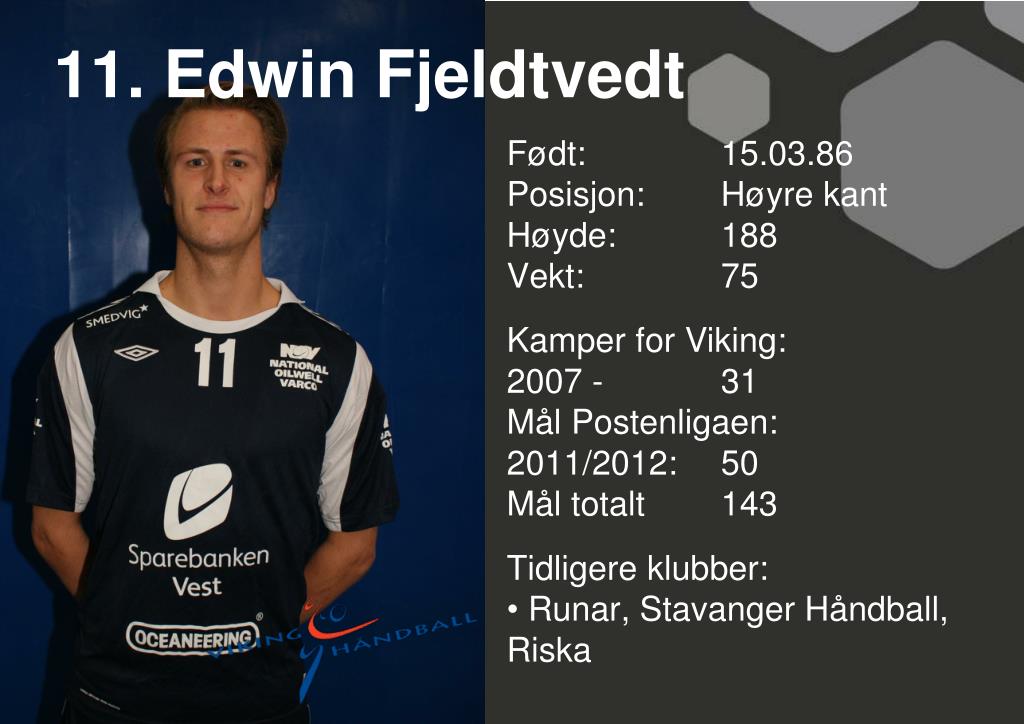 11. Edwin Fjeldtvedt • Født: 15.03.86Posisjon: Høyre kant • Høyde: 188 • Vekt: 75 • Kamper for Viking: • 2007 - 31 • Mål Postenligaen: • 2011/2012: 50Mål totalt 143 • Tidligere klubber: • Runar, Stavanger Håndball, Riska
