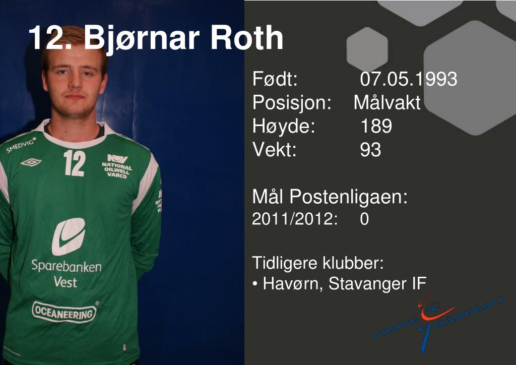 12. Bjørnar Roth • Født: 07.05.1993Posisjon: Målvakt • Høyde: 189 • Vekt: 93 • Mål Postenligaen: • 2011/2012: 0 • Tidligere klubber: • Havørn, Stavanger IF