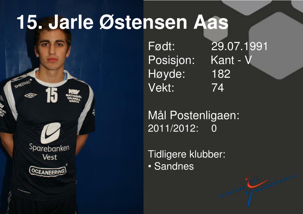 15. Jarle Østensen Aas • Født: 29.07.1991Posisjon: Kant - V • Høyde: 182 • Vekt: 74 • Mål Postenligaen: • 2011/2012: 0 • Tidligere klubber: • Sandnes