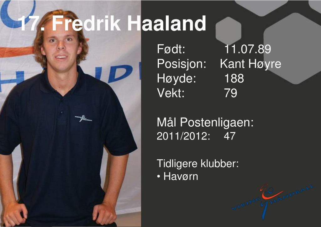 17. Fredrik Haaland • Født: 11.07.89Posisjon: Kant Høyre • Høyde: 188 • Vekt: 79 • Mål Postenligaen: • 2011/2012: 47 • Tidligere klubber: • Havørn