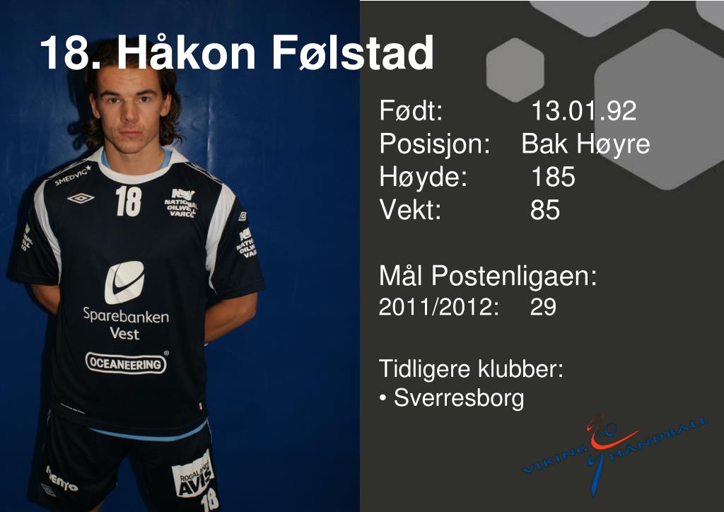 18. Håkon Følstad • Født: 13.01.92Posisjon: Bak Høyre • Høyde: 185 • Vekt: 85 • Mål Postenligaen: • 2011/2012: 29 • Tidligere klubber: • Sverresborg