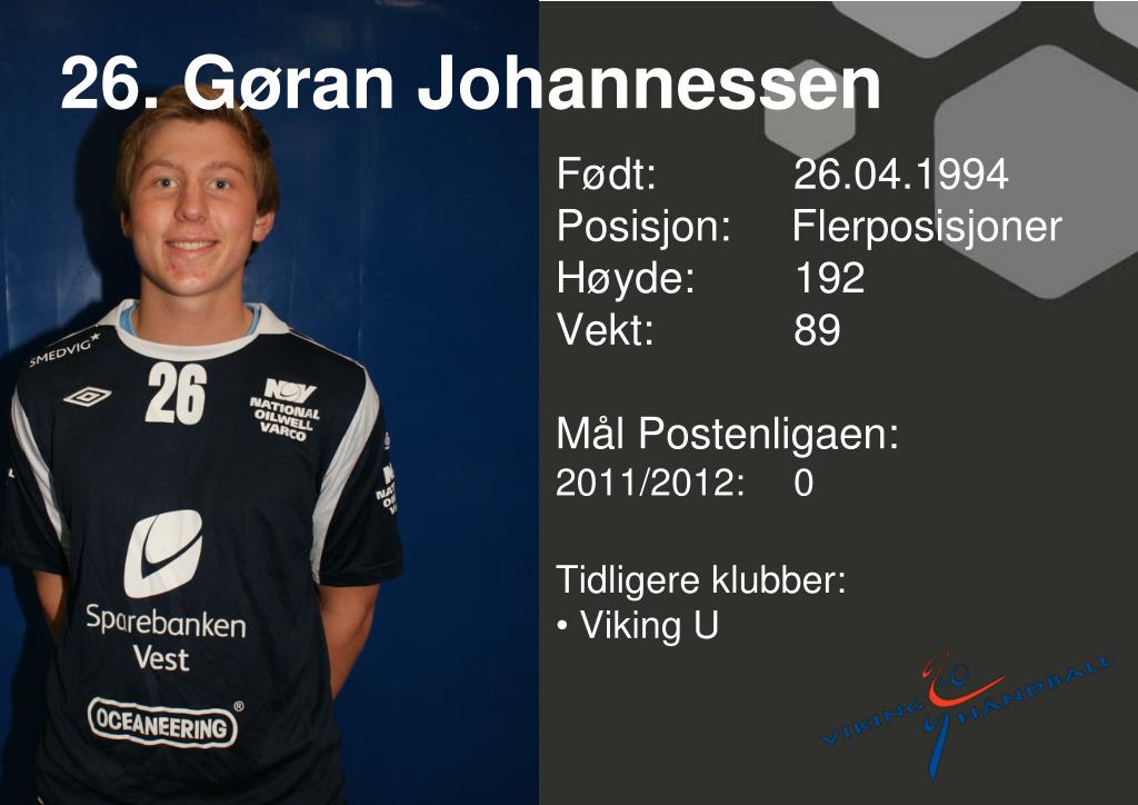 26. Gøran Johannessen • Født: 26.04.1994Posisjon: Flerposisjoner • Høyde: 192 • Vekt: 89 • Mål Postenligaen: • 2011/2012: 0 • Tidligere klubber: • Viking U