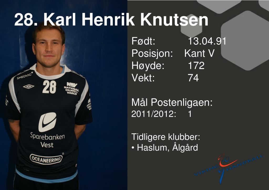 28. Karl Henrik Knutsen • Født: 13.04.91Posisjon: Kant V • Høyde: 172 • Vekt: 74 • Mål Postenligaen: • 2011/2012: 1 • Tidligere klubber: • Haslum, Ålgård