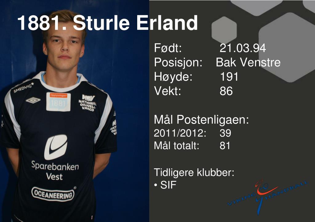 1881. Sturle Erland • Født: 21.03.94Posisjon: Bak Venstre • Høyde: 191 • Vekt: 86 • Mål Postenligaen: • 2011/2012: 39 • Mål totalt: 81 • Tidligere klubber: • SIF
