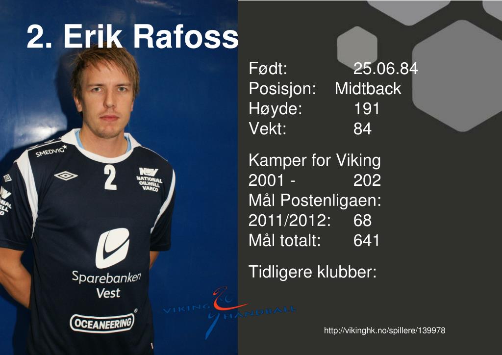 2. Erik Rafoss Født: 25.06.84Posisjon: Midtback Høyde: 191 Vekt: 84 Kamper for Viking2001 - 202Mål Postenligaen: 2011/2012: 68Mål totalt: 641 Tidligere klubber: http://vikinghk.no/spillere/139978