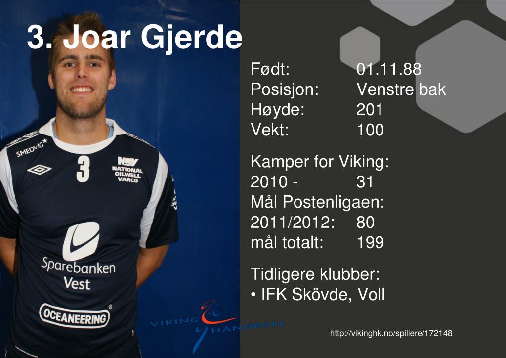 3. Joar Gjerde • Født: 01.11.88Posisjon: Venstre bak • Høyde: 201 • Vekt: 100 • Kamper for Viking: • 2010 - 31 • Mål Postenligaen: • 2011/2012: 80mål totalt: 199 • Tidligere klubber: • IFK Skövde, Voll http://vikinghk.no/spillere/172148