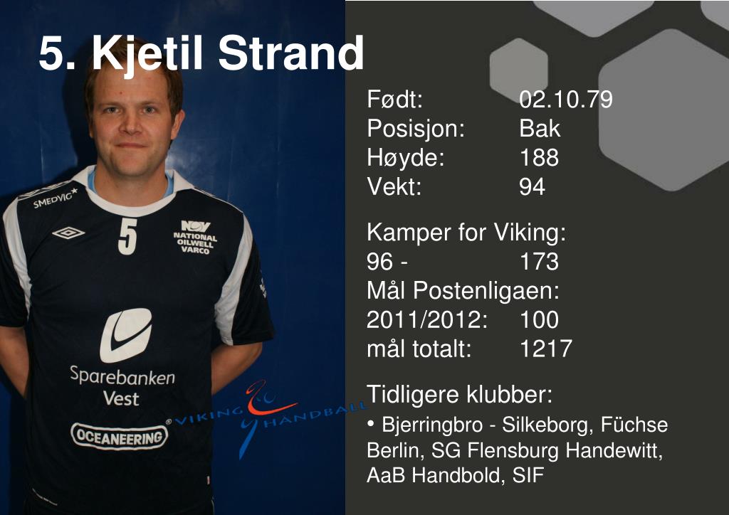 5. Kjetil Strand • Født: 02.10.79Posisjon: Bak • Høyde: 188 • Vekt: 94 • Kamper for Viking: • 96 - 173 • Mål Postenligaen: • 2011/2012: 100mål totalt: 1217 • Tidligere klubber: • Bjerringbro - Silkeborg, Füchse Berlin, SG Flensburg Handewitt, AaB Handbold, SIF