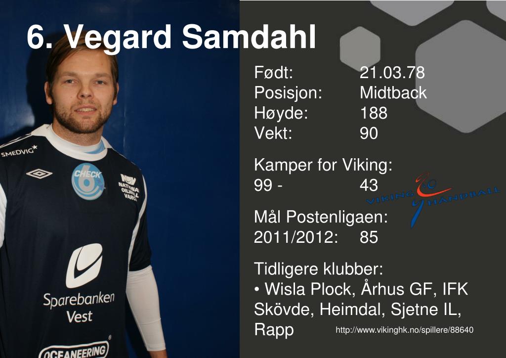 6. Vegard Samdahl • Født: 21.03.78Posisjon: Midtback • Høyde: 188 • Vekt: 90 • Kamper for Viking: • 99 - 43 • Mål Postenligaen: • 2011/2012: 85 • Tidligere klubber: • Wisla Plock, Århus GF, IFK Skövde, Heimdal, Sjetne IL, Rapp http://www.vikinghk.no/spillere/88640