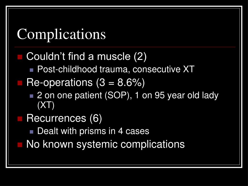 Complications • Couldn’t find a muscle (2) • Post-childhood trauma, consecutive XT • Re-operations (3 = 8.6%) • 2 on one patient (SOP), 1 on 95 year old lady (XT) • Recurrences (6) • Dealt with prisms in 4 cases • No known systemic complications