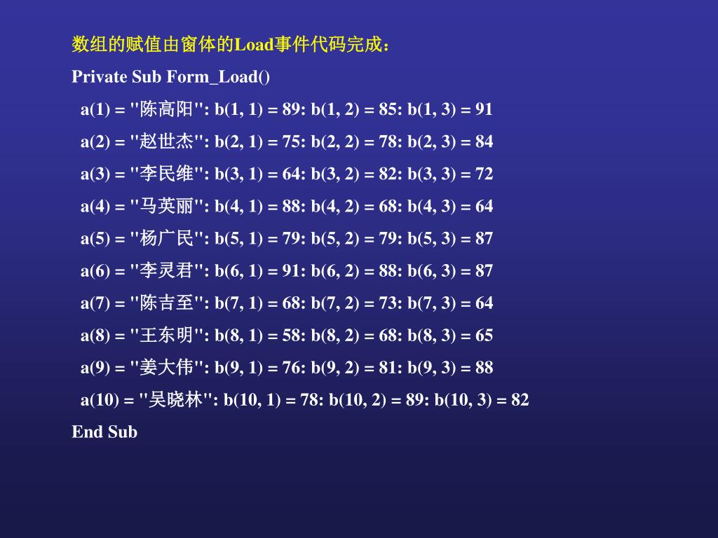 数组的赋值由窗体的Load事件代码完成: Private Sub Form_Load() a(1) = "陈高阳": b(1, 1) = 89: b(1, 2) = 85: b(1, 3) = 91 a(2) = "赵世杰": b(2, 1) = 75: b(2, 2) = 78: b(2, 3) = 84 a(3) = "李民维": b(3, 1) = 64: b(3, 2) = 82: b(3, 3) = 72 a(4) = "马英丽": b(4, 1) = 88: b(4, 2) = 68: b(4, 3) = 64 a(5) = "杨广民": b(5, 1) = 79: b(5, 2) = 79: b(5, 3) = 87 a(6) = "李灵君": b(6, 1) = 91: b(6, 2) = 88: b(6, 3) = 87 a(7) = "陈吉至": b(7, 1) = 68: b(7, 2) = 73: b(7, 3) = 64 a(8) = "王东明": b(8, 1) = 58: b(8, 2) = 68: b(8, 3) = 65 a(9) = "姜大伟": b(9, 1) = 76: b(9, 2) = 81: b(9, 3) = 88 a(10) = "吴晓林": b(10, 1) = 78: b(10, 2) = 89: b(10, 3) = 82 End Sub