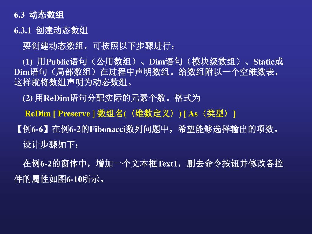 6.3 动态数组 6.3.1 创建动态数组 要创建动态数组,可按照以下步骤进行: (1) 用Public语句(公用数组)、Dim语句(模块级数组)、Static或Dim语句(局部数组)在过程中声明数组。给数组附以一个空维数表,这样就将数组声明为动态数组。 (2) 用ReDim语句分配实际的元素个数。格式为 ReDim [ Preserve ] 数组名(〈维数定义〉) [ As〈类型〉] 【例6-6】在例6-2的Fibonacci数列问题中,希望能够选择输出的项数。 设计步骤如下: 在例6-2的窗体中,增加一个文本框Text1,删去命令按钮并修改各控件的属性如图6-10所示。