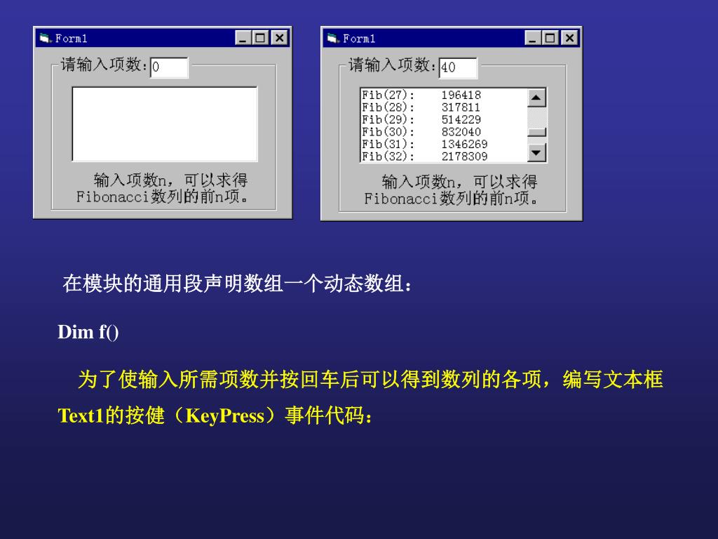 在模块的通用段声明数组一个动态数组: Dim f() 为了使输入所需项数并按回车后可以得到数列的各项,编写文本框Text1的按健(KeyPress)事件代码: