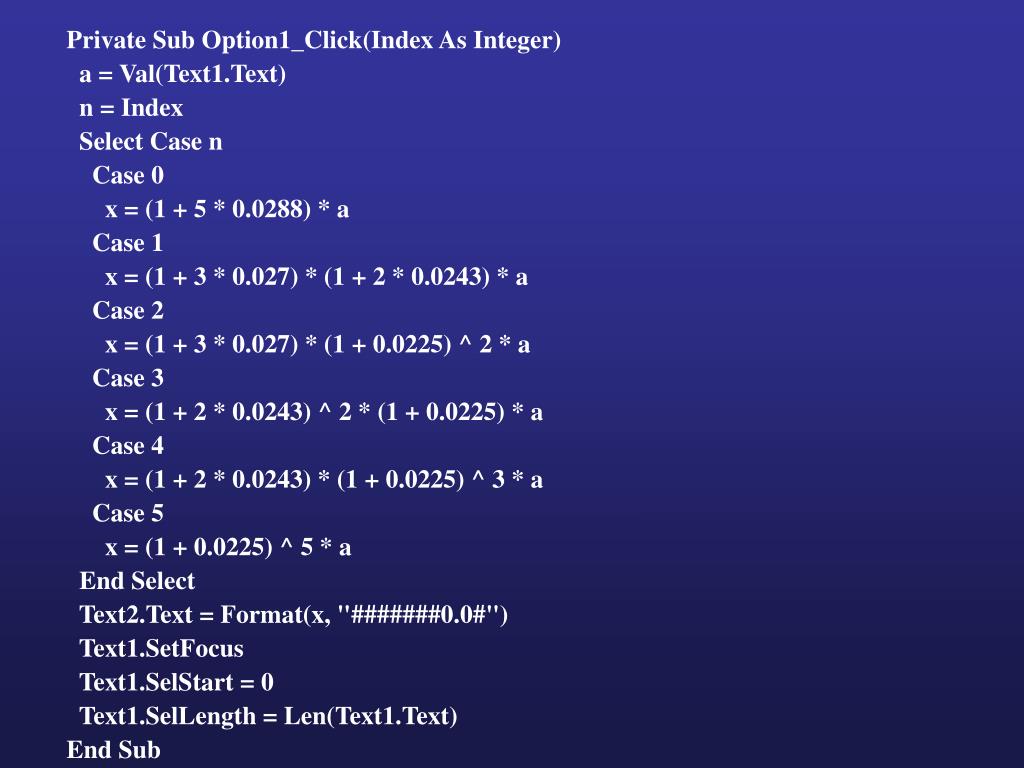 Private Sub Option1_Click(Index As Integer) a = Val(Text1.Text) n = Index Select Case n Case 0 x = (1 + 5 * 0.0288) * a Case 1 x = (1 + 3 * 0.027) * (1 + 2 * 0.0243) * a Case 2 x = (1 + 3 * 0.027) * (1 + 0.0225) ^ 2 * a Case 3 x = (1 + 2 * 0.0243) ^ 2 * (1 + 0.0225) * a Case 4 x = (1 + 2 * 0.0243) * (1 + 0.0225) ^ 3 * a Case 5 x = (1 + 0.0225) ^ 5 * a End Select Text2.Text = Format(x, "#######0.0#") Text1.SetFocus Text1.SelStart = 0 Text1.SelLength = Len(Text1.Text) End Sub
