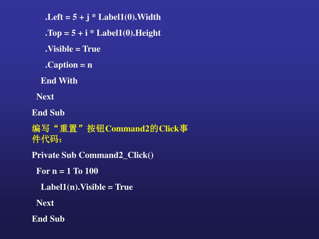 .Left = 5 + j * Label1(0).Width .Top = 5 + i * Label1(0).Height .Visible = True .Caption = n End With Next End Sub 编写“重置”按钮Command2的Click事件代码: Private Sub Command2_Click() For n = 1 To 100 Label1(n).Visible = True Next End Sub
