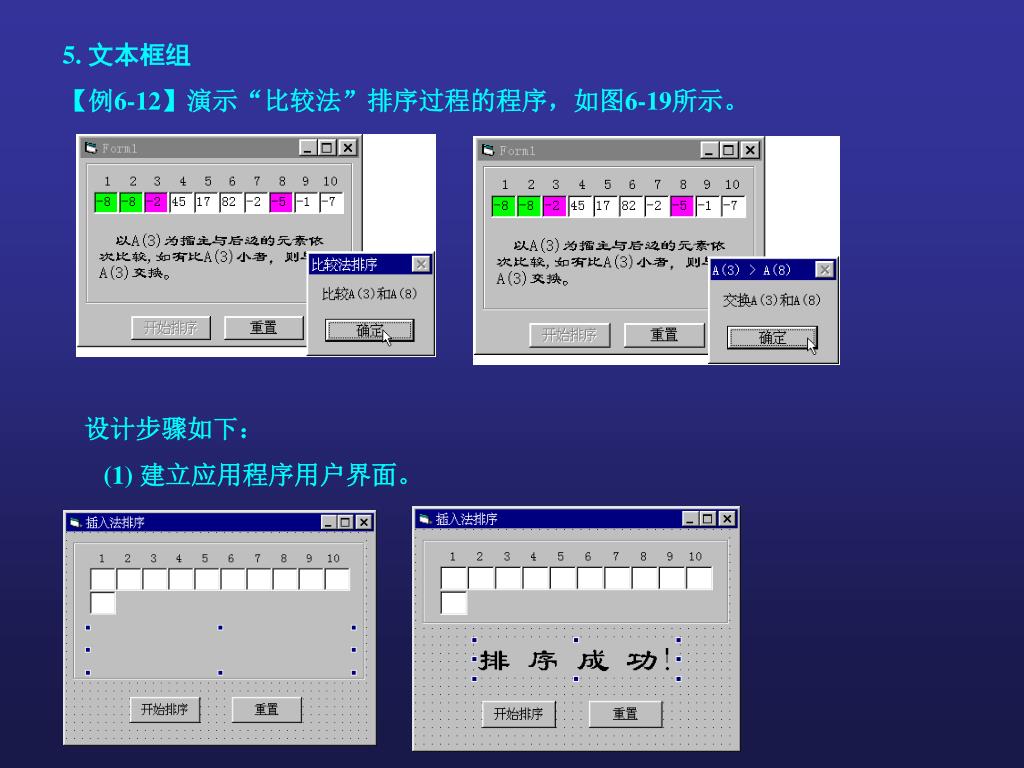 5. 文本框组 【例6-12】演示“比较法”排序过程的程序,如图6-19所示。 设计步骤如下: (1) 建立应用程序用户界面。