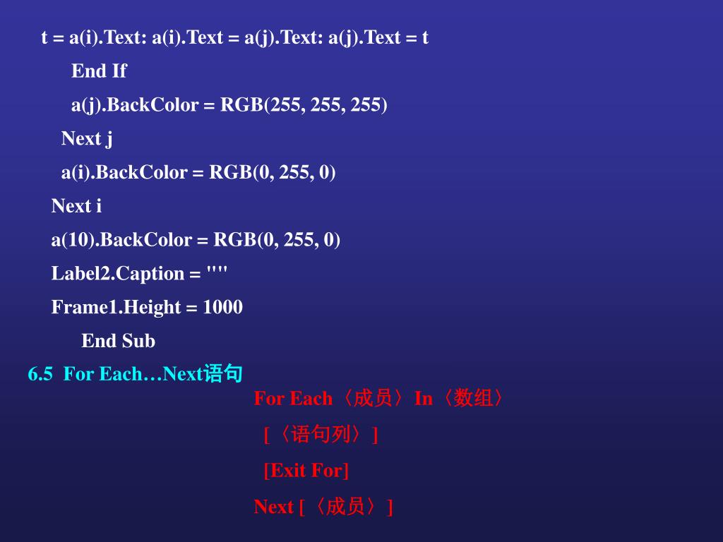 t = a(i).Text: a(i).Text = a(j).Text: a(j).Text = t End If a(j).BackColor = RGB(255, 255, 255) Next j a(i).BackColor = RGB(0, 255, 0) Next i a(10).BackColor = RGB(0, 255, 0) Label2.Caption = "" Frame1.Height = 1000 End Sub 6.5 For Each…Next语句 For Each〈成员〉In〈数组〉 [〈语句列〉] [Exit For] Next [〈成员〉]