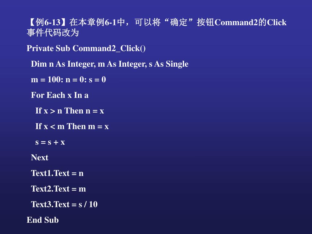 【例6-13】在本章例6-1中,可以将“确定”按钮Command2的Click事件代码改为【例6-13】在本章例6-1中,可以将“确定”按钮Command2的Click事件代码改为 Private Sub Command2_Click() Dim n As Integer, m As Integer, s As Single m = 100: n = 0: s = 0 For Each x In a If x > n Then n = x If x < m Then m = x s = s + x Next Text1.Text = n Text2.Text = m Text3.Text = s / 10 End Sub