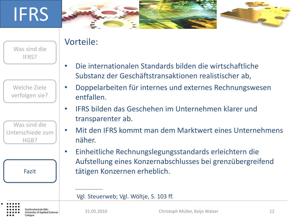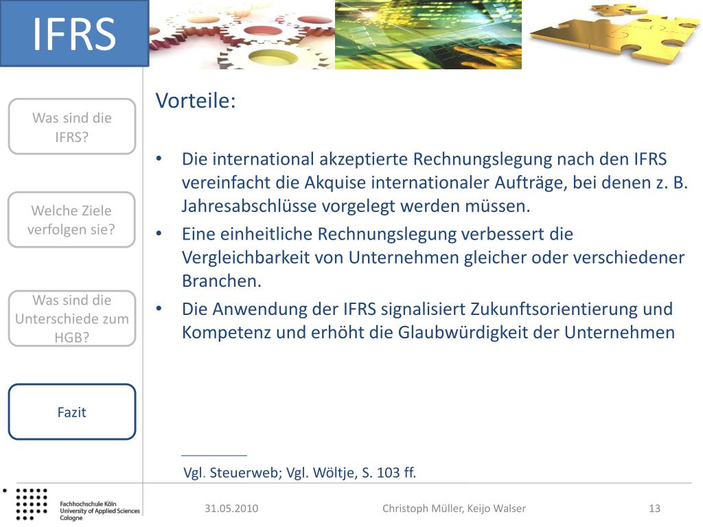 IFRS Wassind die IFRS? Vorteile: • Die international akzeptierte Rechnungslegung nach den IFRS vereinfacht die Akquise internationaler Aufträge, bei denen z. B. Jahresabschlüsse vorgelegt werden müssen. • Eine einheitliche Rechnungslegung verbessert die Vergleichbarkeit von Unternehmen gleicher oder verschiedener Branchen. • Die Anwendung der IFRS signalisiert Zukunftsorientierung und Kompetenz und erhöht die Glaubwürdigkeit der Unternehmen Welche Ziele verfolgen sie? Was sind die Unterschiede zum HGB? Fazit Vgl. Steuerweb; Vgl. Wöltje, S. 103 ff. Christoph Müller, Keijo Walser