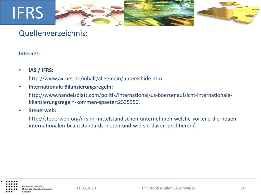 IFRS Quellenverzeichnis: Internet: • IAS / IFRS: http://www.ax-net.de/inhalt/allgemein/unterschide.htm • Internationale Bilanzierungsregeln: http://www.handelsblatt.com/politik/international/us-boersenaufsicht-internationale-bilanzierungsregeln-kommen-spaeter;2535950. • Steuerweb: http://steuerweb.org/ifrs-in-mittelstandischen-unternehmen-welche-vorteile-die-neuen-internationalen-bilanzstandards-bieten-und-wie-sie-davon-profitieren/. Christoph Müller, Keijo Walser
