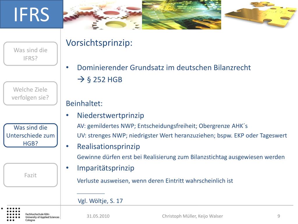 IFRS Vorsichtsprinzip: • Dominierender Grundsatz im deutschen Bilanzrecht • § 252 HGB • Beinhaltet: • Niederstwertprinzip • AV: gemildertes NWP; Entscheidungsfreiheit; Obergrenze AHK´s • UV: strenges NWP; niedrigster Wert heranzuziehen; bspw. EKP oder Tageswert • Realisationsprinzip • Gewinne dürfen erst bei Realisierung zum Bilanzstichtag ausgewiesen werden • Imparitätsprinzip • Verluste ausweisen, wenn deren Eintritt wahrscheinlich ist Wassind die IFRS? Welche Ziele verfolgen sie? Was sind die Unterschiede zum HGB? Fazit Vgl. Wöltje, S. 17 Christoph Müller, Keijo Walser