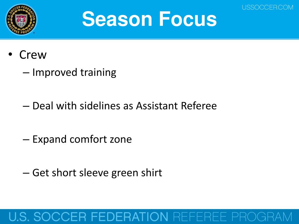 Season Focus • Crew • Improved training • Deal with sidelines as Assistant Referee • Expand comfort zone • Get short sleeve green shirt